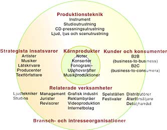 som är en vertikal linje." För att beskriva den svenska musikindustrin som ett industriellt kluster har vi identifierat fem huvudområden, nämligen kärnprodukter, strategiska insatsvaror, produktionsteknik och relaterade verksamheter (se figur 1). Kärnprodukterna produceras av skivbolag (fonogram), produktionsbolag (musikproduktioner), musikförlag (noter och upphovsrätter) samt turnéproduktions- och bokningsbolag (konserter). Strategiska insatsvaror ("råvarorna" i klassisk industrijargong) utgörs av det "kreativa humankapitalet", det vill säga artister, musiker, låtskrivare, producenter med flera. Produktionsteknik är en sammanfattning av den teknik som krävs för att producera kärnprodukterna. Relaterade verksamheter består dels av stödjande verksamheter från studios till skivbutiker, dels av ett antal bransch- och intresseorganisationer. En ytterligare central beståndsdel i musikklustret är naturligtvis kunder och konsumenter. Dessa kan indelas i företagskunder (B2B) och enskilda konsumenter (B2C). En B2B-kund i detta sammanhang är till exempel en artist som köper en låt av ett produktionsbolag eller ett skivbolag som köper en videoproducents tjänster. En B2C-kund är till exempel undertecknade när de köper en skiva eller går på en konsert.